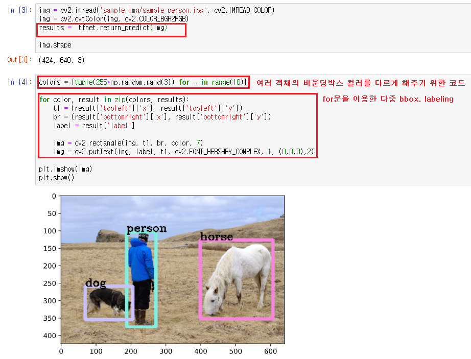 - 각 개체 별로 바운딩 박스의 컬러를 다르게 하기 위해 In [4]에 코드를 추가했다.