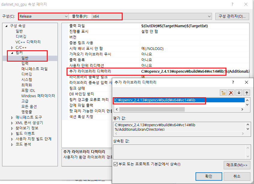| 2. [링커] - [일반] - [추가 라이브러리 디렉터리] : C:\opencv_2.4.13\opencv\build\x64\vc14\lib |