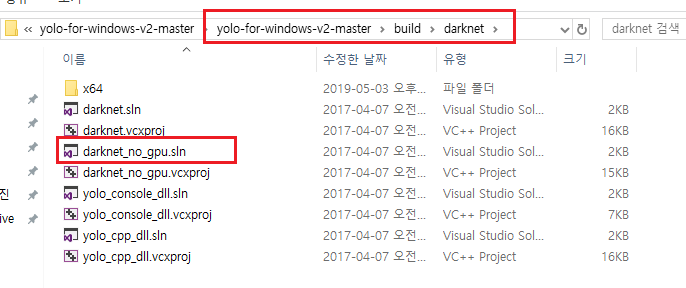 - 압축을 푼 상태에서 [yolo-for-windows-v2-master] - [build] - [darknet] 폴더에 sln파일이 있다.