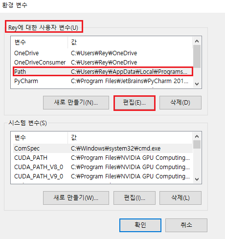 - [시스템 환경변수] - [user에 대한 사용자 변수] - [path] - [편집]