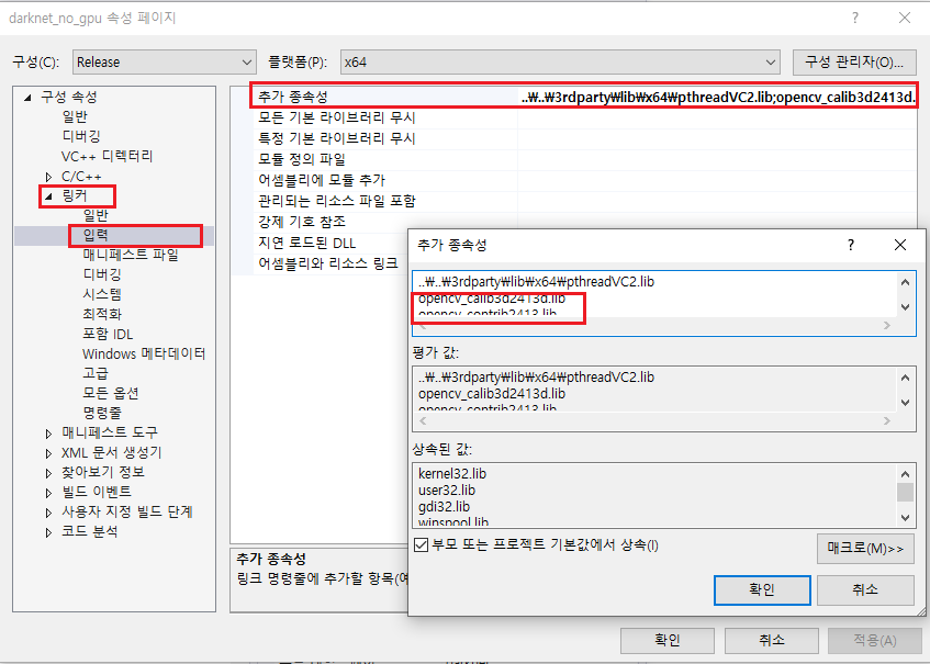 | 3. [링커] - [입력] - [추가 종속성] : C:\opencv_2.4.13\opencv\build\x64\vc14\bin 내의 dll 확장자를 lib로 바꿔 추가 |