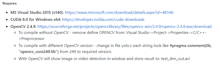 - 해당 Github에 의하면 MS Visual Studio 2015 (v14.0)과 CUDA 8.0 for Window x64, OpenCV 2.4.9이 요구된다.