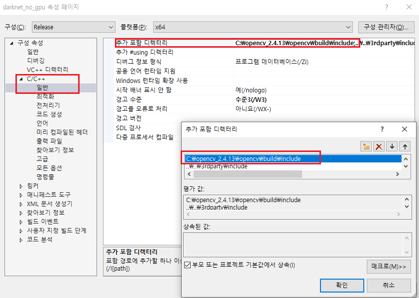 | 1. [C/C++] - [일반] - [추가포함디렉터리] : C:\opencv_2.4.13\opencv\build\include |