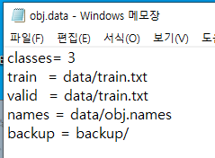 - obj.data 파일을 열어 classes를 분류할 갯수만큼 적어준다. (여기에서는 head, body, tail 3가지로 설정하였음)