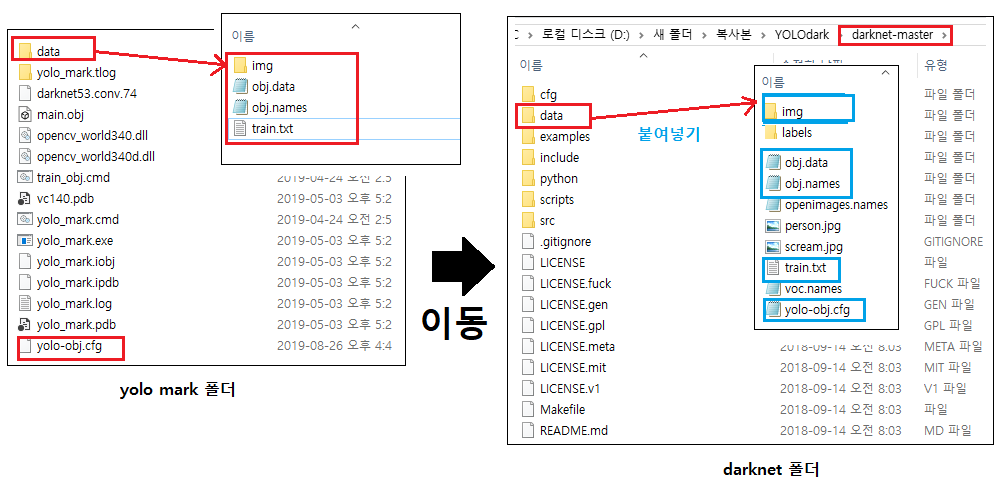 - img, obj.data, obj.names, train.txt 는 yolo-for-windows-v2-master\build\darknet\x64\data 폴더에 넣는다.