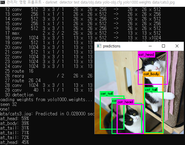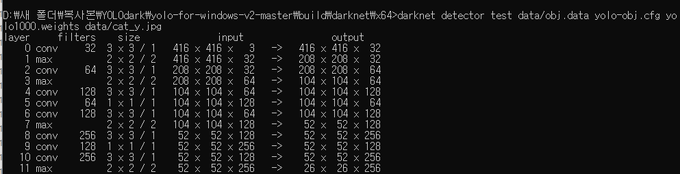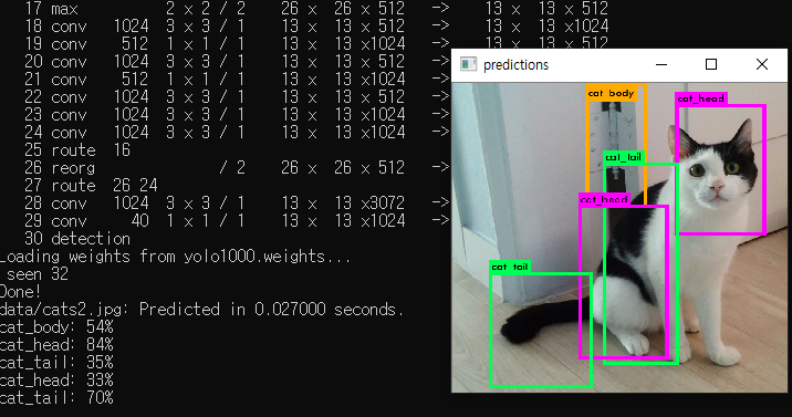 | yolo-for-windows-v2-master\build\darknet\x64>darknet detector test data/obj.data yolo-obj.cfg yolo1000.weights data/cat_y.jpg |