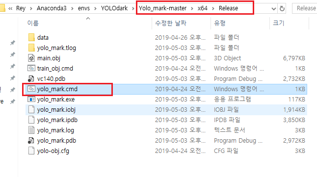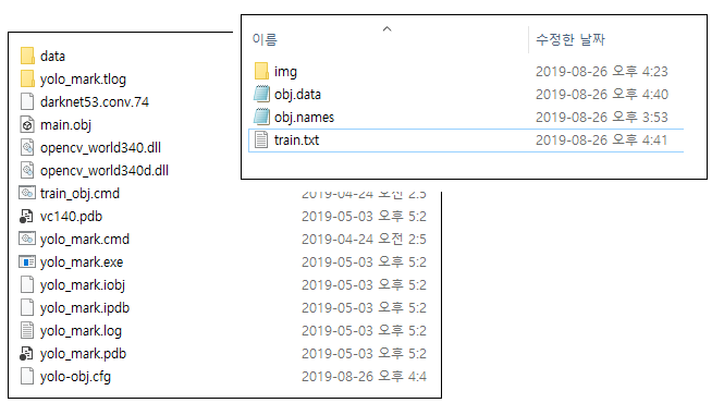 - yolo-obj.cfg , yolo_mark/x64/Release/data 경로 내의 image 폴더, obj.names, obj.data, train.txt