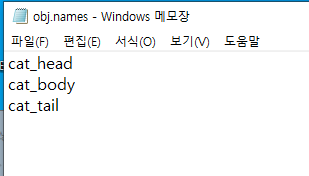 - obj.names 파일을 열어 분류 명칭을 입력하고 저장한다.