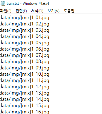 - train.txt를 열어보면 라벨링을 위해 저장된 이미지 데이터의 정보를 확인 할 수 있다.