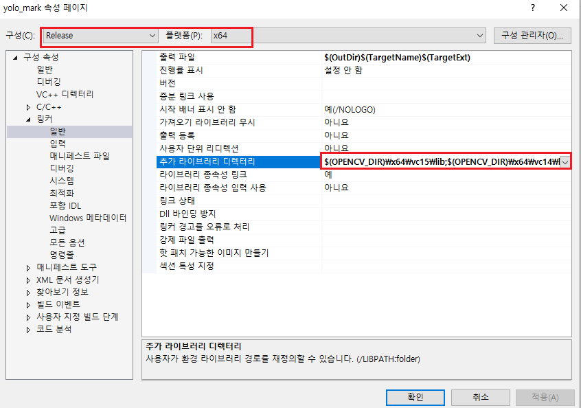 - 프로젝트 속성의 Release x64를 확인하면 $(OPENCV_DIR)으로 설정되어있다.