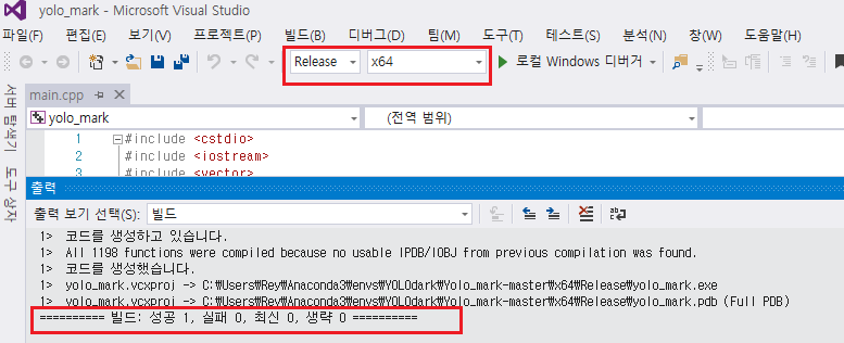 - Release x64로 빌드하여 빌드가 성공하면 x64/Release 폴더에 yolo_mark.exe가 생성된 것을 확인할 수 있다.