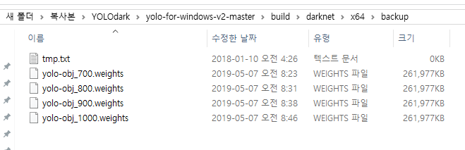 - 훈련이 끝나면 backup 폴더에 아래 이미지와 같이 가중치 모델이 저장된다.