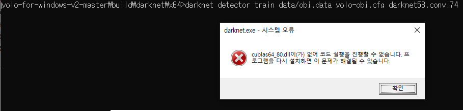 "cublas64_80.dll이 없어 코드 실행을 진행할 수 없습니다. 프로그램을 다시 설치하면 이 문제가 해결될 수 있습니다."