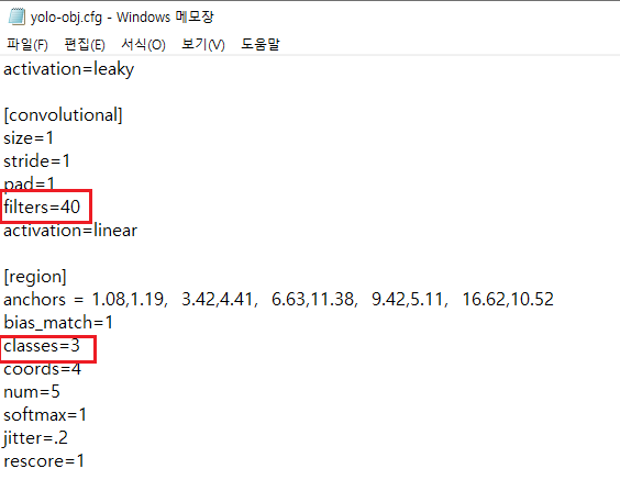 - [region]의 윗부분 [convolutional] 의 filters를 5 * (classes+5)에 맞게 설정하기위해 5*(3+5) = 40으로 변경하였다.