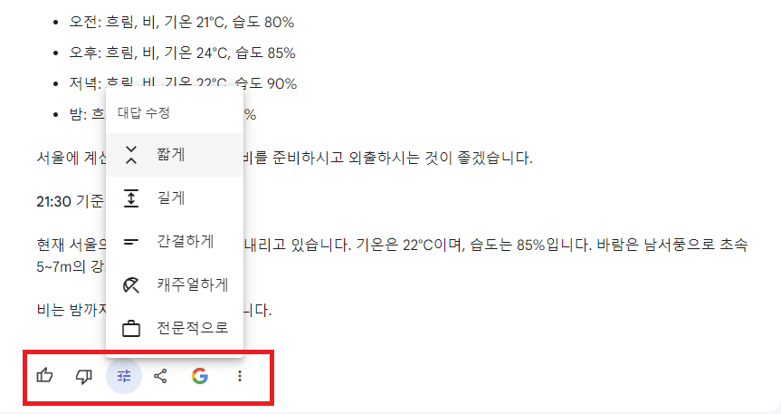 - 대답 수정을 누르면 짧게, 길게, 간결하게 등으로 문장을 수정하여 보여줍니다.